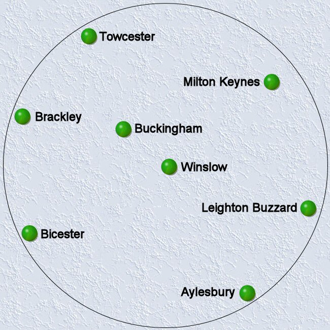 Based near Winslow we generally cover North Buckinghamshire, Milton Keynes, Buckingham and Aylesbury with villages in between, but the map below will give a better indication. If you fall inside the circle we will probably be able to assist you. |